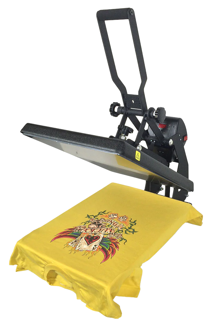 Grande presse à chaud à clapet de 16″ x 20″ (40,6 x 50,8 cm) avec élément chauffant flottant (plateau supérieur mobile), utilisée pour la préparation du textile avant impression, le séchage du pré-traitement et de l’encre, ou pour le transfert de films DTF ou autres films autocollants.