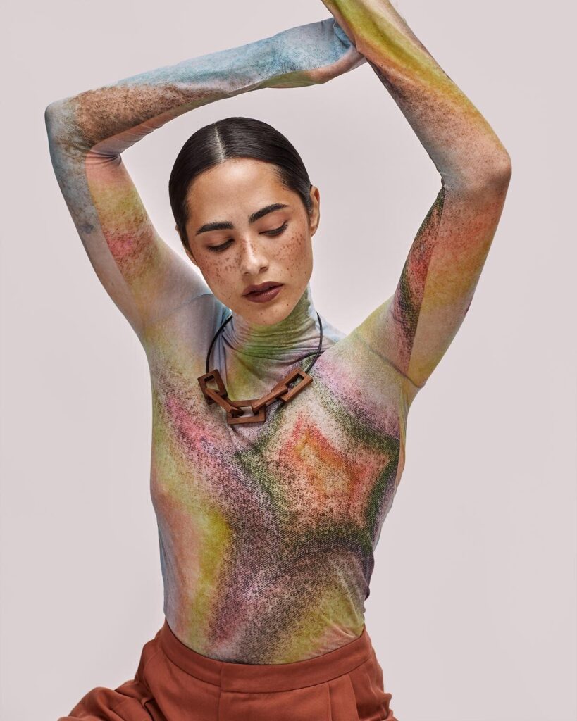 « J’ai une obsession avec les lignes graphiques, j’aime comment les formes peuvent interagir entre elles », confie la designer qui présente entre autres dans sa collection des colliers en bois aux chaînes XL ou des pendentifs en cuir ou en argent sertis de cercle de bois rappelant le cosmos.