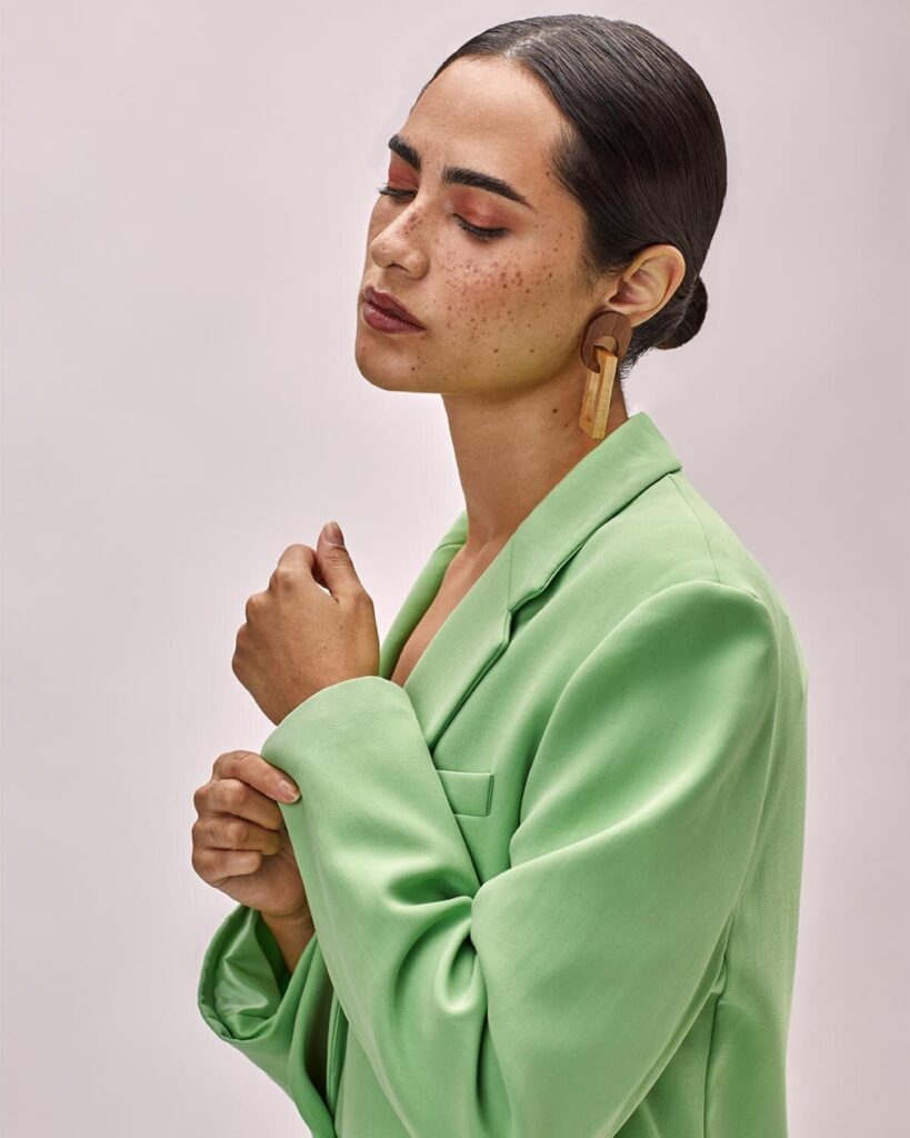 « J’aime comment des formes géométriques très simples peuvent être porteuses de sens. Comme le cercle, à la symbolique vraiment riche. Mes créations en bois, je les ai souvent vues comme des références à la lune et aux planètes. Juste avec la texture et le veinage du bois, les bijoux deviennent des univers en soi », confie la créatrice, qui a commencé à créer des bijoux en bois parce qu’elle n’en trouvait pas à son goût, au look contemporain et luxueux.