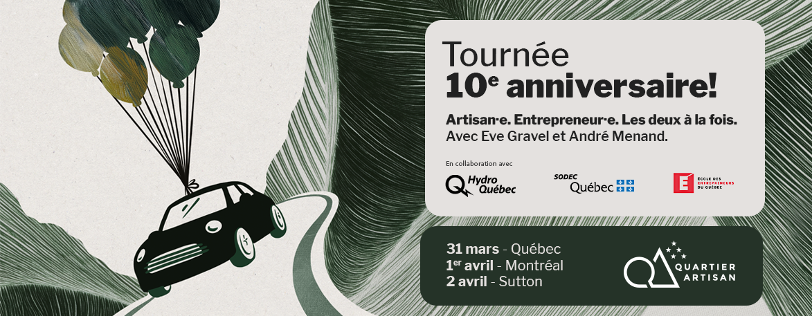 Cette année, Quartier Artisan et sa tournée soufflent leurs 10 bougies. Dix ans à parcourir la province pour aller à la rencontre des artisan·es, à célébrer leur résilience, leur créativité et leur audace. Dix ans de rencontres, de témoignages et d’inspirations qui nous ont rappelé, année après année, pourquoi cette communauté mérite d’être célébrée haut et fort. C’est donc avec beaucoup de fierté et de reconnaissance que nous vous convions à cette édition anniversaire, une édition à la hauteur du chemin parcouru.